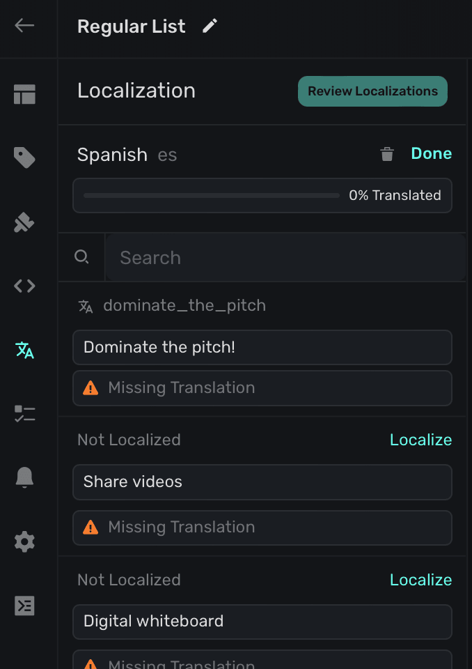 If there are any existing text components on your paywall, all of them with currently unlocalized strings will populate in the sidebar (in this example, we're localizing our text for Spanish speakers):