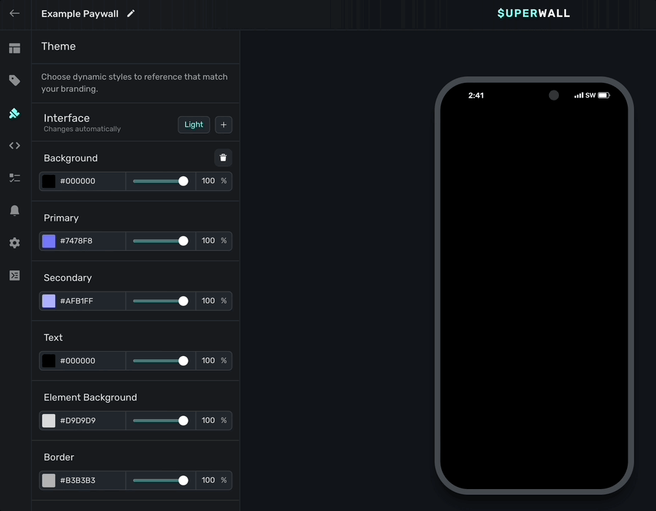 Superwall will copy all of your theme values over to the dark interface style, and from there you can customize them specifically for dark mode.
