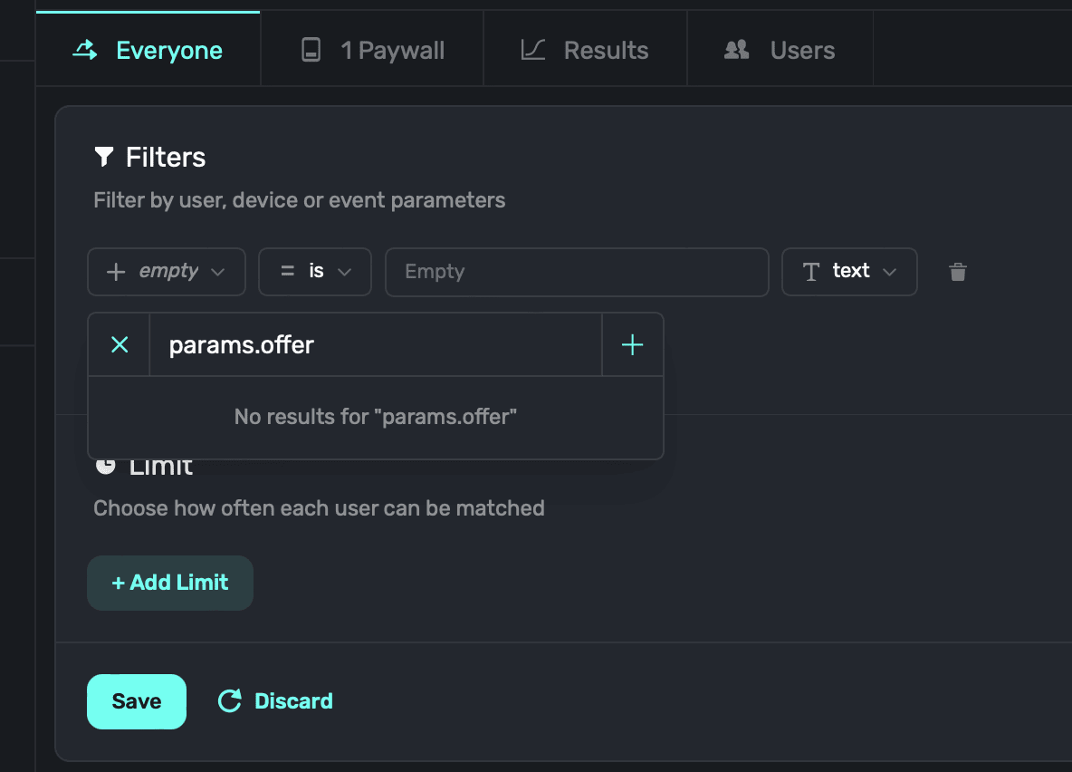 Superwall will ask what type of new parameter this is — choose Placement and enter the parameter name once more (i.e. "offer"). Click Save: