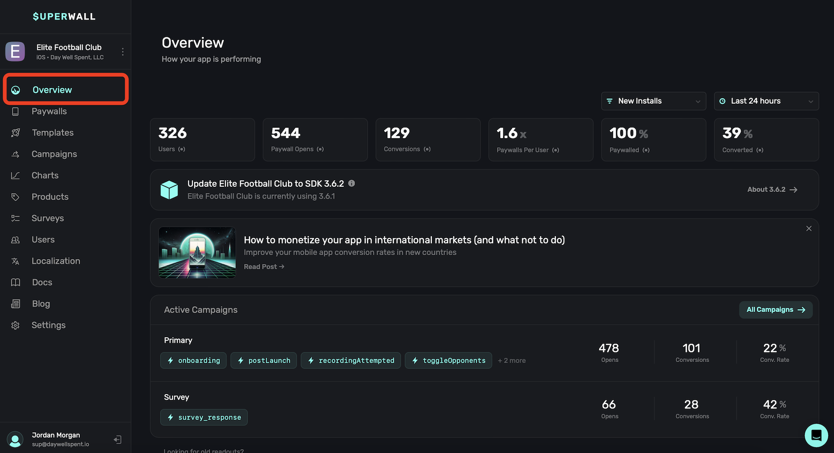Once you've logged into Superwall, you'll be taken to the Overview page. Here, you can view key metrics and important campaign performance about your app.