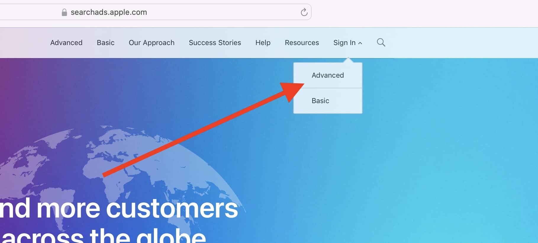- Go to searchads.apple.com and click Sign In -> Advanced.